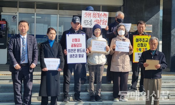 ‘여주시신청사범시민대책위원회’ 최근 기자 회견.한편, 청사 이전을 반대하는 ‘여주시 신청사 범시민대책위원회’는 지난 13일 오전 시청에서, 신청사 문제는 특정 행정의 문제가 아니라 여주시 전체의 미래와 직결된 시민 공동의 문제임을 들어, 여주시 신청사 기공식 강행 중단을 요구하는 기자 회견과 항의서한을 여주시에 전달했다.